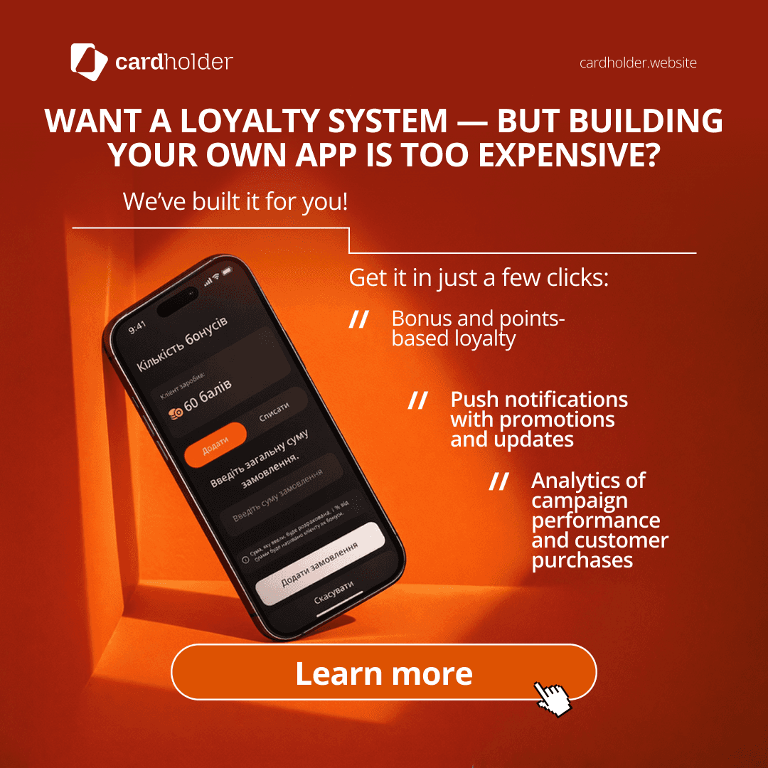 CardHolder — мобільна платформа лояльності з цифровою QR-карткою, що об’єднує бонусні програми, акції, аналітику та комунікацію з клієнтами в одному застосунку. Вона допомагає локальним бізнесам підвищувати рівень утримання клієнтів, автоматизувати програми лояльності та формувати довготривалі відносини з аудиторією через ефективні інструменти залучення.